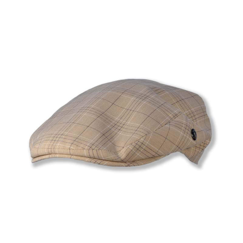 Gorra visera de caballero indicada para el verano, confeccionada en polyester, lino y lana fría. Diseño en rayas haciendo cuadros sobre un fondo beige. *El color de las fotografías puede variar ligeramente del original.